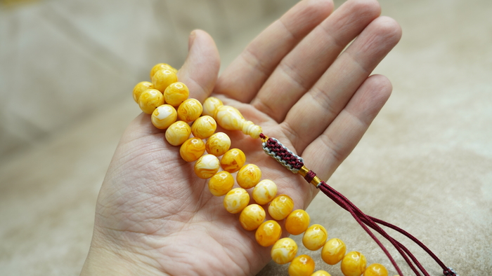 مسباح مستكة شبيه الكهرب الاصلي شكل مميز ولون يأسر الأنظار بجماله، خرزات المسباح مجموعة بخيط متين بلون خمري متجانس بأناقة تامة مع لون الحبات ليبرز الأناقة الكاملة ..