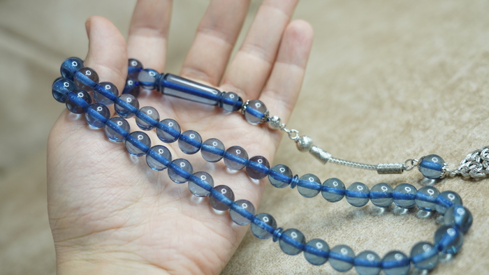 مسباح بكلايت اكوامارين يرمز للجمال والصفاء بلونه الأزرق الرائع وشفافيته، لمحبي الفخامة هذا المسباح هو لكم بلا شك..